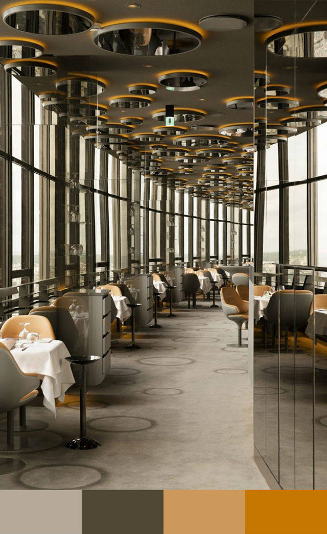在最后,我们可以看到,金色和紫色常常代表高贵奢华,金色或紫色的配色方案通常是高级餐厅在室内设计当中的最好选择。