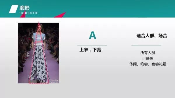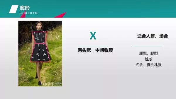 这一张则为X型,主要特征为两头宽,中间收腰。它既可以运用于长裙,也可用于短裙。图中的短裙对体型要求比较高。较为修长、匀称的体型才能穿得比较好看,但即使你有一些微胖或腰身并不是很明显,这一廓形也可起到修正的作用。
