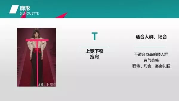 接下来是T字型。这两年大家如果看女装的秀场就会发现,特别是西服,都会在肩部加一些垫肩,以突出肩部造型。这种廓形会营造一种气势感,较为适合高管女性。