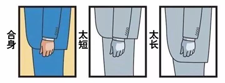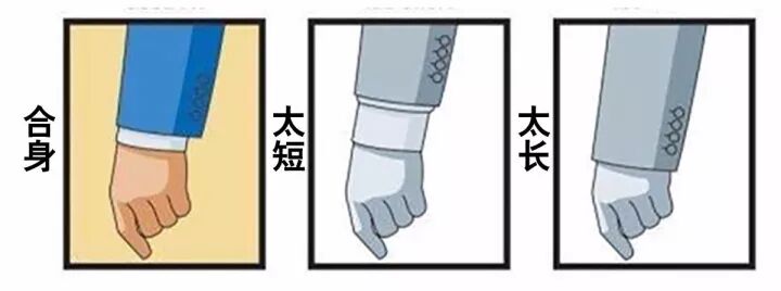 手臂自然下垂是感觉没有拉扯感,袖口处露出衬衫1-1.5cm最为合适,不过作为成品西装袖口比较长也很常见,可以购买后改短。