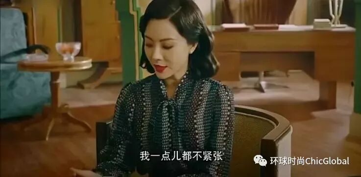 在酒会上,陈佳影穿着一套丝绸衬衫裙亮相,虽然不是传统旗袍却尽显风韵。领子上的原型珠宝配饰就是旗袍文化中的“点”,领口下垂的褶皱一直到腰间就是旗袍文化的“线”,小编注意到下垂的另一只手,从几个手指里分明都是“戏”。