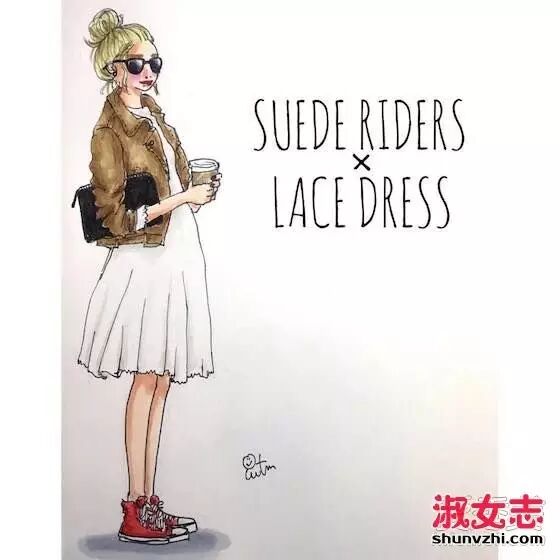 蕾丝连衣裙搭配麋鹿皮的外套,女孩气十足的时候又有一点轻复古。高高束起的丸子头和大红色的帆布鞋又是活力十足。