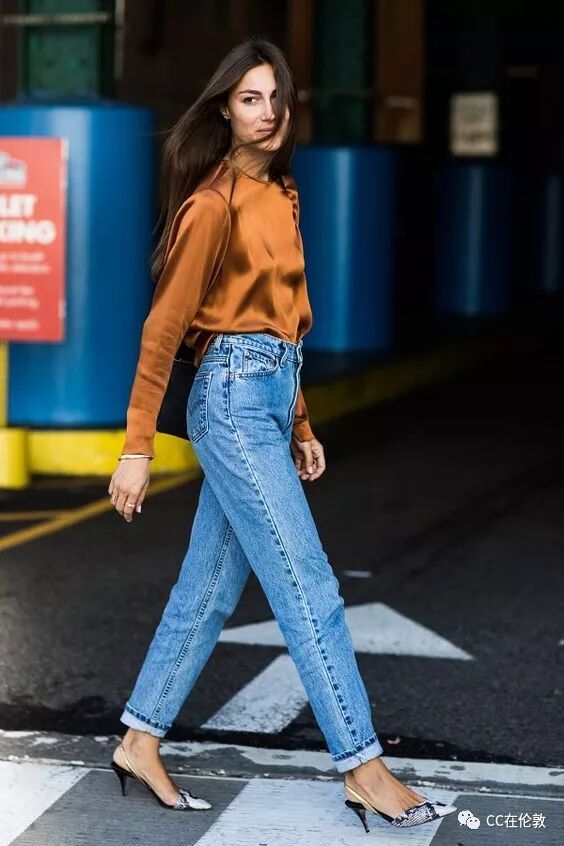 牛仔裤本身就是街头休闲造型必备的百搭单品,它跟缎面服装刚刚好气质互补,一个随意帅气,另一个精致优雅,穿在一起却无比协调 ▼