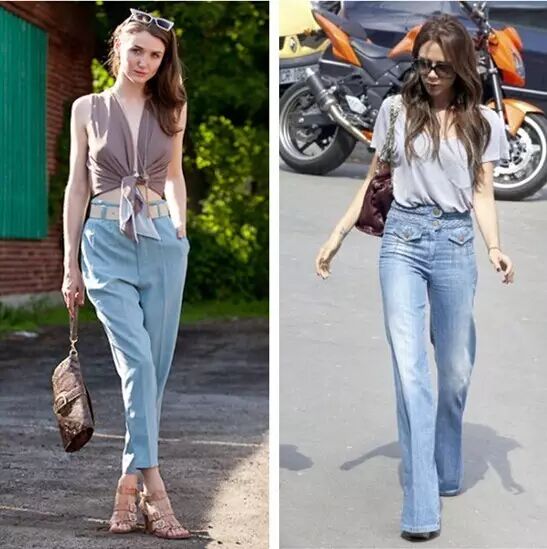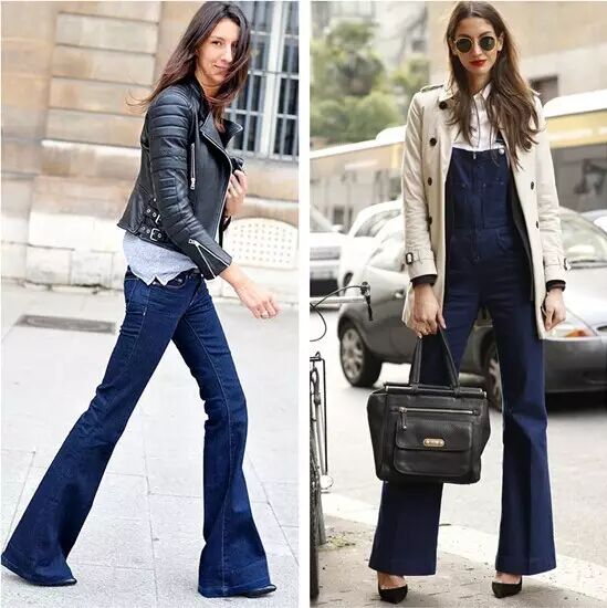 喇叭牛仔裤合体的喇叭牛仔裤能够创造长腿的视觉效果,裤头要刚好卡在腰部的款式,配上短款上衣最能起到上下同步拉长的效果,使人显高显瘦。