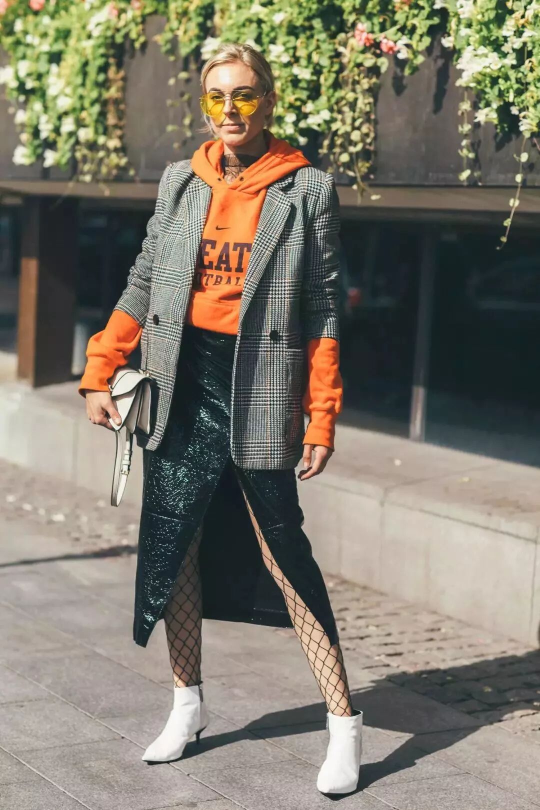 如果要用卫衣走混搭风,一刚一柔的“娘man风”就是搭配精髓。这里的搭配要点是,裙子越柔软越好,视觉和触感上的强烈对比才能达到很好的效果。