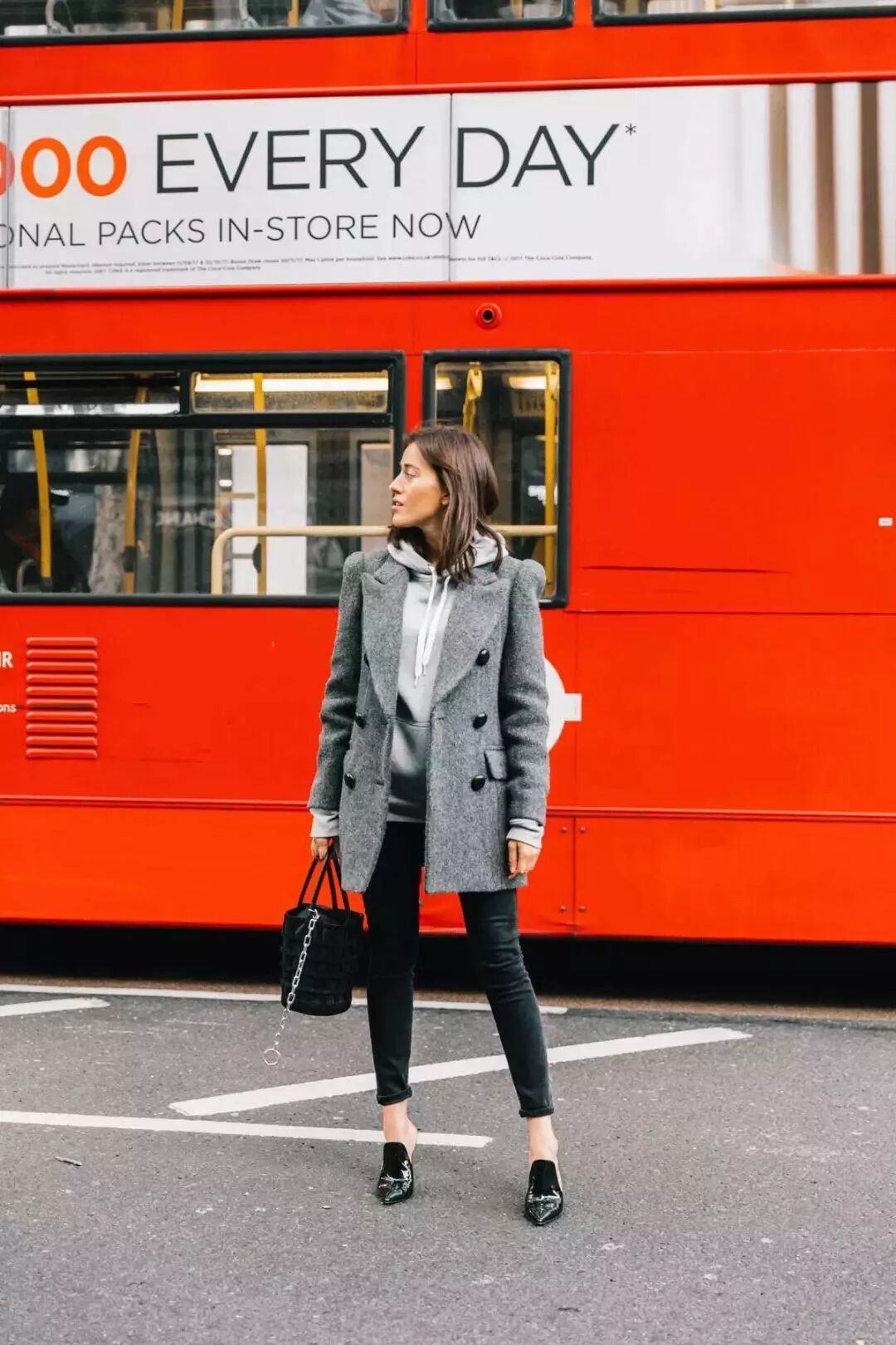红色卫衣和粉色大衣属于同色系,下装选择百搭的灰色,皮肤白的女生可以尝试。