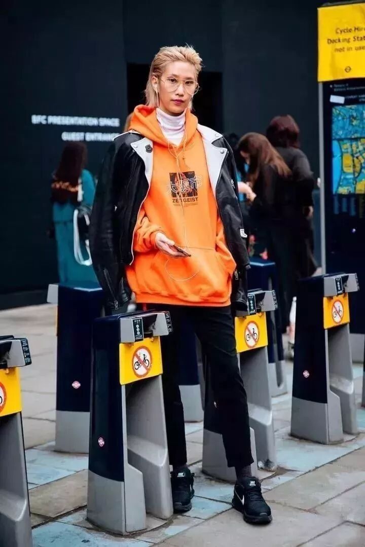 秋冬季的小外套数不胜数,但是最常穿的也无非是机车皮衣和牛仔外套,机车皮衣也是黑色款最百搭,这时候就可以选择一件亮色的连帽衫来做内搭,比起其它色彩更有吸眼点。