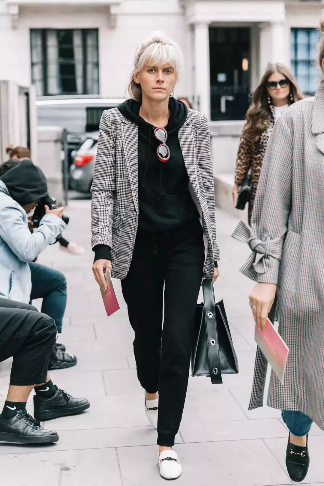 即使是严肃的西装款式,有了卫衣的搭配后,也瞬间变得轻松、时髦起来。