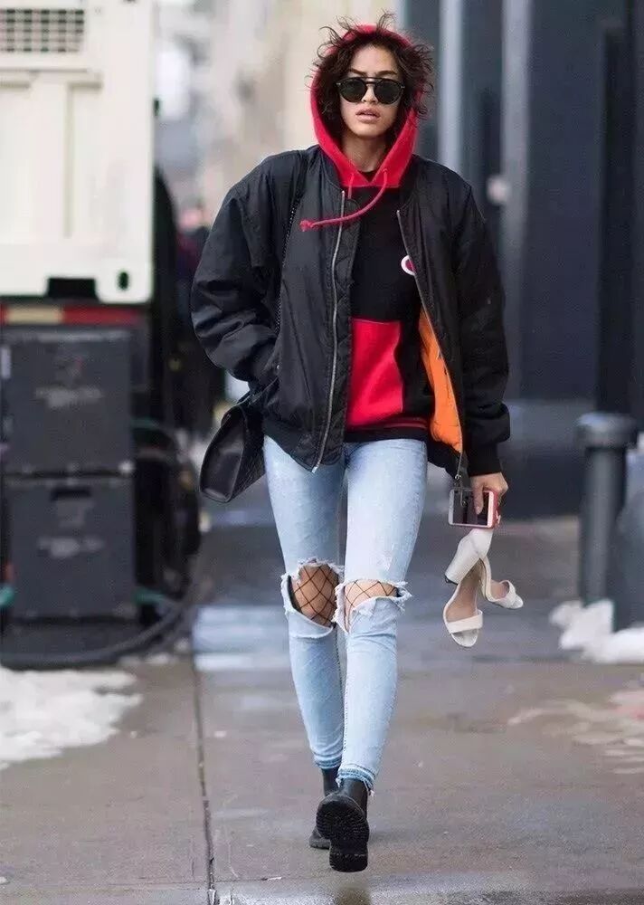 棒球服相反在秋天很少见,反而是到了冬天,加厚加棉的棒球服和卫衣简直不能再搭,甚至很多棒球服的设计原本就带有卫衣的帽子。gigi用灰色卫衣搭配黑色棒球服,扎起的马尾让她看起来造型感十足。