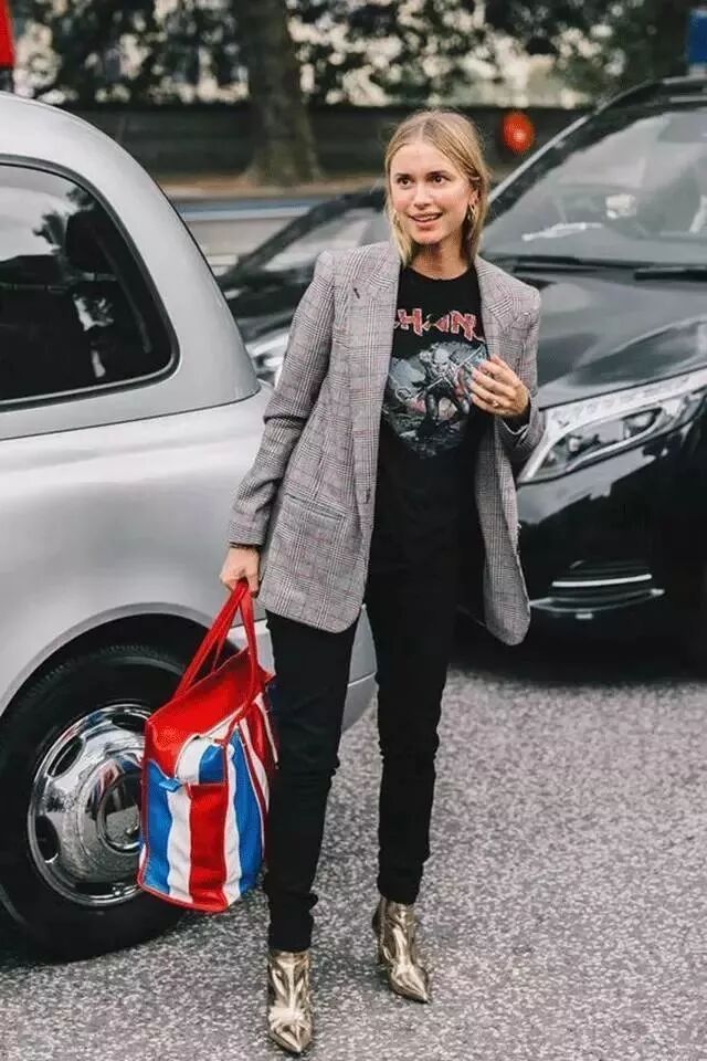 卫衣搭配丝绒西装意外的时髦,蓝色牛仔裤和切尔西短靴也被她穿出了自己的味道来。