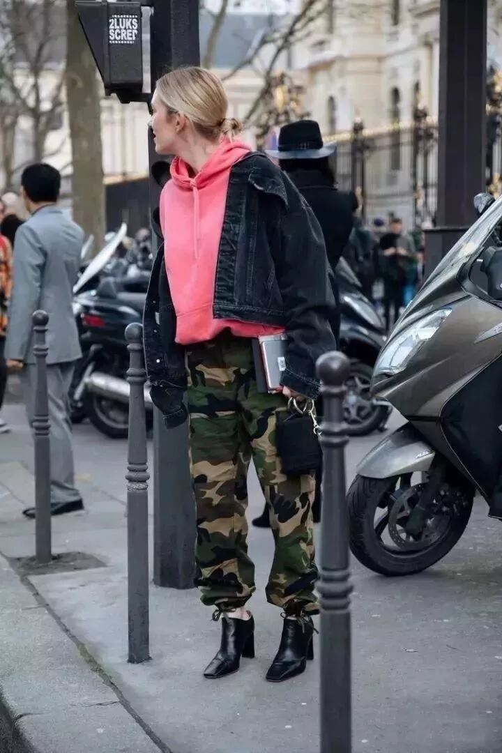 冬天越是枯燥无味的季节越要拒绝all black ,搭配草绿色的卫衣,年轻活力,绿色中有了一些灰度后更显高级,这种方法适用于所有亮色系的卫衣,选择带一些灰度的,更适合冬天。
