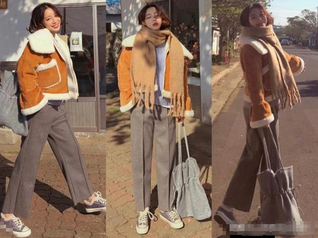 灰色的毛呢阔腿裤搭配橘黄色羊羔毛外套,内搭灰色打底+姜黄色围巾,Vivamoon对色彩搭配的掌控非常好,整套搭配看起来非常的温柔减龄,在阔腿裤的搭配下,更是看不出胯宽,气质非常高级,对于身材不够高的女生,阔腿裤最好选择高腰款哦!