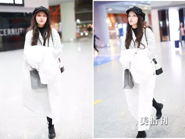 程潇的白色印花衬衫搭配黑色高领衫,视觉上显得甜美很多,再加上外面的白色羽绒服外套,整个造型给人一种清新高级的少女气息。