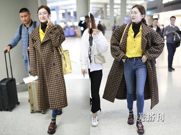江疏影的另外一套衬衫+高领衫造型是黑色高领衫+黄色衬衫,用低调的黑色高领衫来修饰出优雅的脖颈,黄色衬衫则点亮整体,并且颜色与格纹大衣的黄色相互应,整个造型很有复古减龄的学院气息。