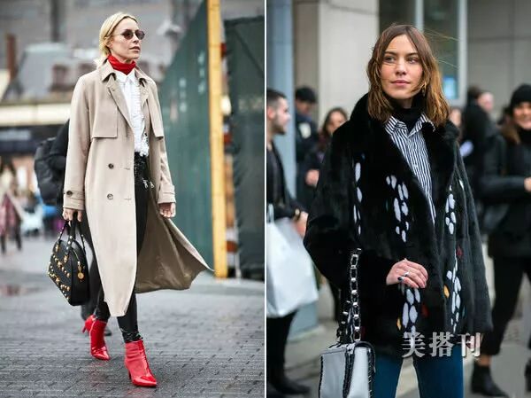 除了国内明星,很多时尚达人和国外明星也都很喜欢衬衫+高领衫的搭配。红色高领衫搭配荷叶边白白衬衫,这身造型甜美有亮点,右边的条纹衬衫搭配黑色高领衫亮点虽不多但很实用百搭。