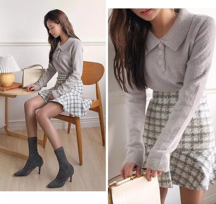 06 纯白的针织不会毫无特色,这不是针织的风格,无论多么简单,针织都有办法让自己在简单中寻找出彩的地方。卷边圆领的俏皮,有小巧的知性,波浪花边的释放为搭配A字伞裙增加底气。