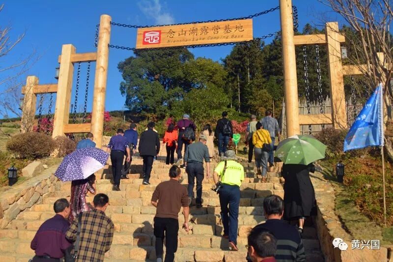 念山湖里还设置有一个声控喷泉,站在湖边,对着麦克风喊叫,湖里的喷泉会随着喊声喷薄而出,喊声分贝的高低决定水柱高低。也不知道是我老人家喊声力度不够,还是机器有问题,我拼出吃奶的力气喊叫,别说是喊出水柱,连水花都看不见,真是让我好没面子,其他几位作家也和我差不多,喊不出喷泉的水柱,看来这玩意儿也不是什么人都可以玩的转的。说来也怪,星溪乡的许厚康书记随便喊喊,都能喊出几十米高的水柱,而且连喊几次,都是水柱冲天。这不知道是他运气好,还是技巧好。边上有人和他开玩笑说,好兆头啊,看来许书记运势正旺,还有上升空间啊。聆听许书记的介绍,看的出这位年轻的书记是个干实事的人。虽是玩笑,老朽我还是真诚的祝愿他还有更大的上升空间,在更高的层次里为人民服务。参观完“念山湖露营基地”,我们一行继续往山顶前进。