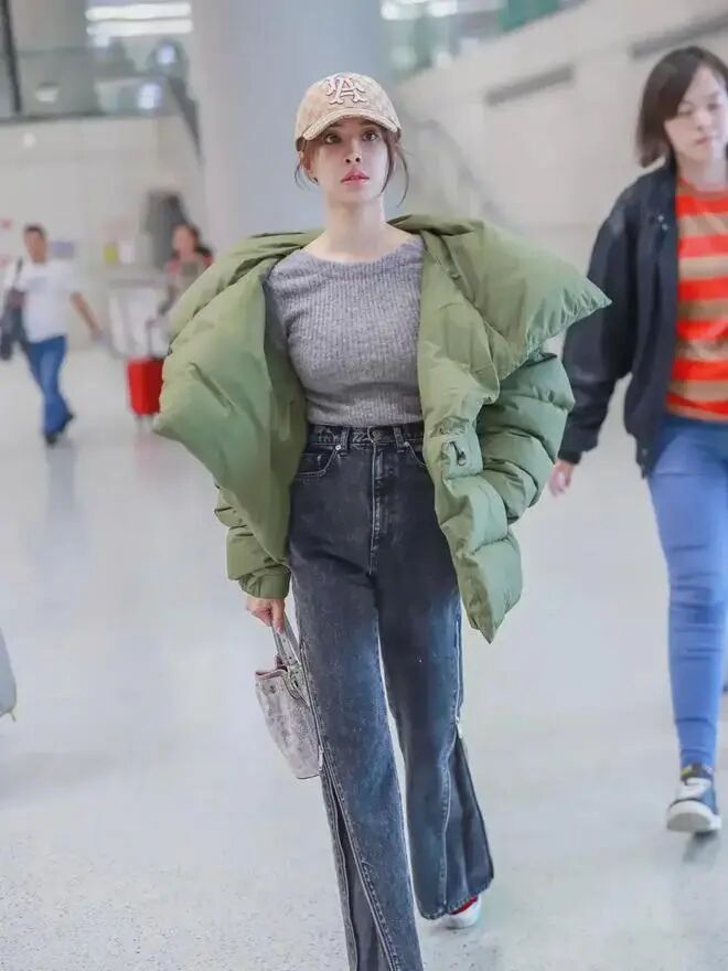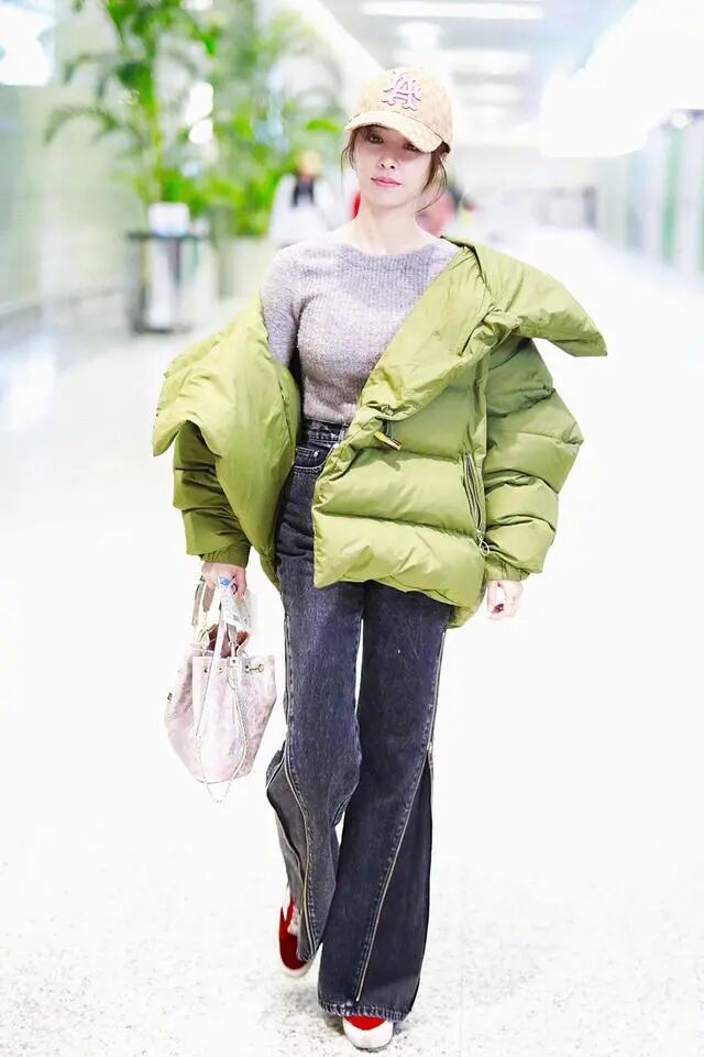 蔡依林身着的这条“酒杯裤”无疑是她整体造型的点睛之笔。这款裤子采用了独特的剪裁设计,裤腿呈现出一种向下收窄的趋势,形状犹如倒置的酒杯,因此得名“酒杯裤”。这种设计不仅能够凸显出蔡依林的腿部线条,还使得整体造型更加具有层次感和立体感。同时,这款“酒杯裤”还采用了高腰设计,进一步拉长了蔡依林的身材比例,让她看起来更加高挑挺拔。在上衣的选择上,蔡依林同样展现出了她的时尚品味。她选择了一件绿色短款羽绒服作为搭配,这款羽绒服的设计简约而不失时尚感,绿色的色调也给人一种清新脱俗的感觉。短款的设计能够凸显出蔡依林的腰线,与下身的“酒杯裤”形成了完美的呼应。此外,羽绒服的保暖性能也让蔡依林在寒冷的天气中依然能够保持时尚与温度并重。