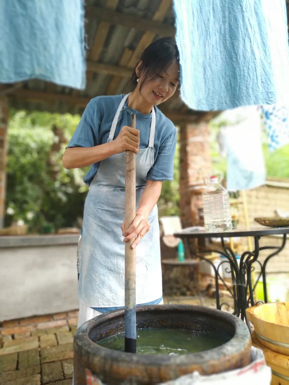 就这样,草木蓝染走进求石民宿,而这缸染水,如天空和海洋一般的蓝,像幕布挂在天上,当它披在女人们的肩上时,更是风采卓绝、翩翩伊人。