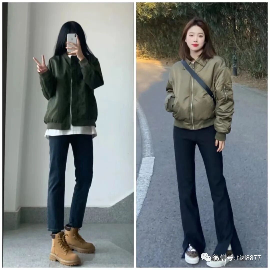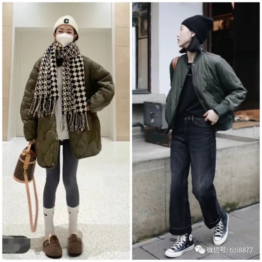 饱和度低的军绿色棉服上身显白又洋气,下半身搭蓝色喇叭牛仔裤真的是绝配,秋冬穿也不会冷,又时髦又保暖~