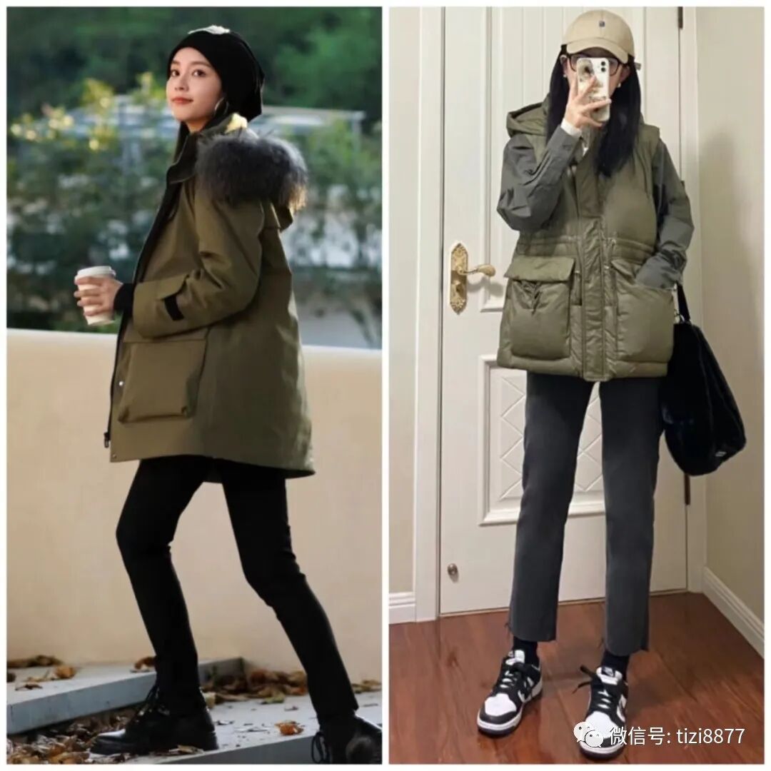 柔和的米白色毛衣显得人皮肤白皙温柔,选择军绿色的羽绒服作为外套,复古又时尚,到膝盖的长度保暖又能遮盖腿部缺陷~