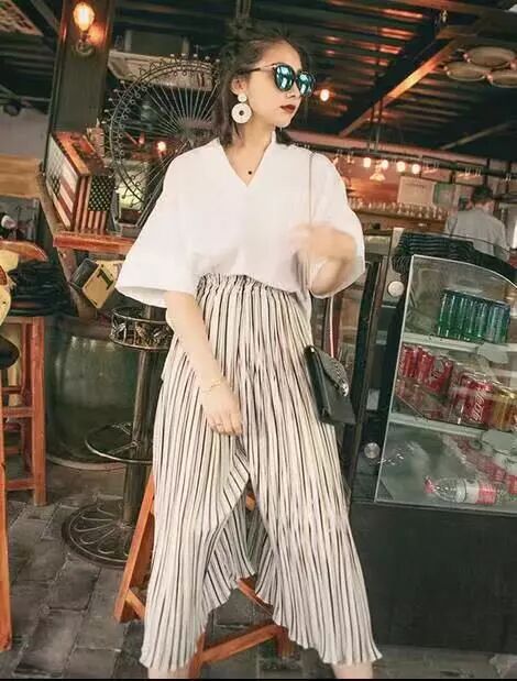 就好比这张图,上衣搭配一条竖黑白条纹裤子,大长腿效果立显。