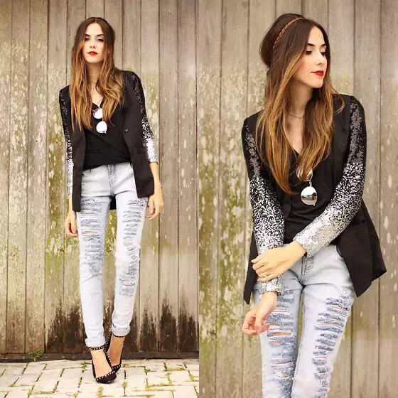 这件西装造型个性前卫,拼接黑白渐变色袖,内搭黑色打底衫显得深沉神秘,领口挂银色墨镜装饰点缀出时尚靓丽,而下身破缝牛仔裤则将时尚升级,搭配高跟鞋更显高挑范。