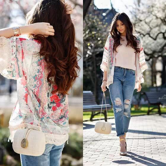 花纹开衫面料飘逸艳丽,搭配相近色套头衫十分衬肤色,下穿九分牛仔裤翻脚边,裤膝破洞设计显得时髦大气,卡其高跟鞋,卡其链条小包,突出色调搭配美。