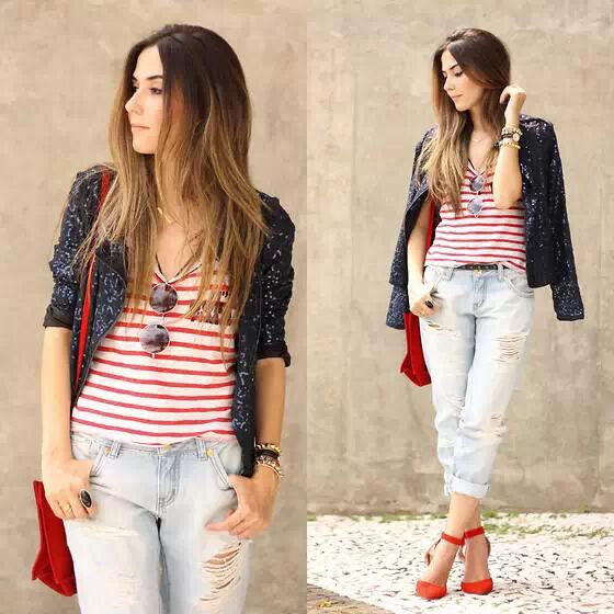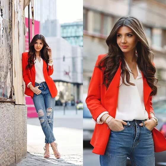红色西服比较艳丽奔放,里搭白色雪纺开衫和谐视觉冲击力,下穿破洞九分牛仔裤,搭配高跟鞋,充满街头时尚味,又不失OL风范。
