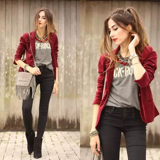 朱红色西装外套,搭配灰色T恤衫胸前印字母,脖子处红色与银色项链装饰,点缀得更加美丽。而黑色紧身牛仔裤修腿显瘦,搭黑色低筒靴呈显保暖帅气。