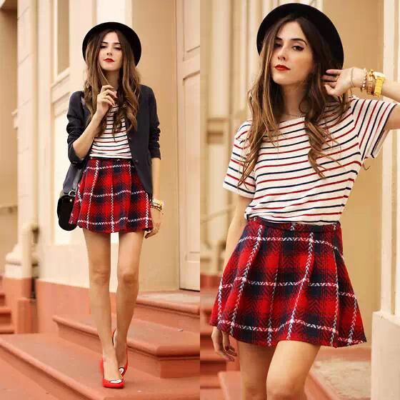 黑色小西装休闲舒适,内搭条纹短袖打底衫,下穿红色格纹小摆裙,展露色调奔放和可爱,秀出性感美腿,搭配一双红色高跟鞋更显高挑美丽。