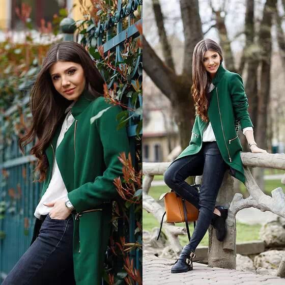 绿色拉链大衣,看起来比较简洁帅气,里搭雪纺衬衫用作色彩点缀装饰,下穿深色铅笔牛仔裤搭皮鞋,将时尚帅气升级。