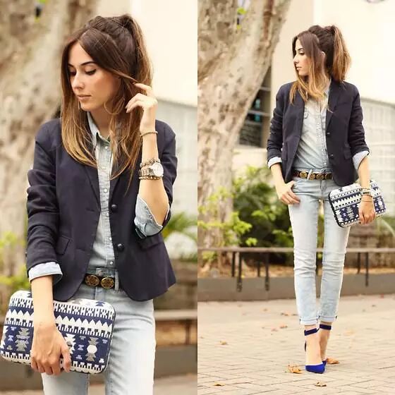黑色小西装简约休闲,里搭浅蓝牛仔衬衫帅气干练,下穿修身牛仔裤翻脚边,再搭蓝色高跟鞋拉长腿部曲线,彰显时尚帅气高挑美。