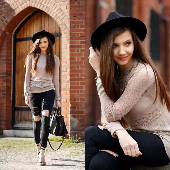 杏色毛织套头衫,款式织法采用花纹镂空针,看上去柔软轻薄又性感,下搭黑色牛仔裤,而裤身破洞设计十分夸张吸人,在搭配一双高跟凉鞋协调身姿美。
