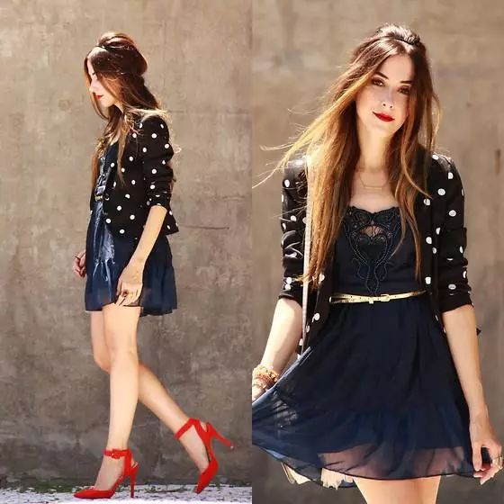 黑色小西装,衣身印满白色圆点纹看起来很有美感,里搭蓝色丝薄连衣裙,胸前珠链花纹充满民族艺术感,在金色腰带点缀下更时尚,裙摆透明露大腿搭配红色高跟鞋,突显妩媚和艳丽。