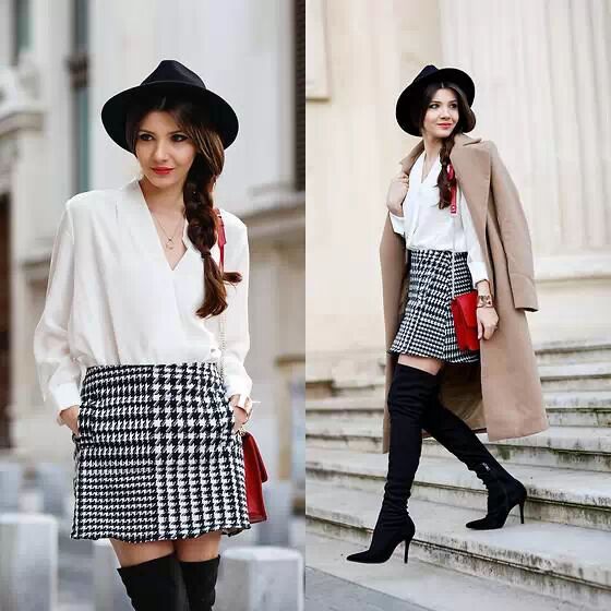 白色无扣雪纺衫,V领露锁骨突出一丝性感美,在搭配金色项链装饰,外穿卡其驳领大衣非常帅气潇洒,下搭黑白花纹短裙~着身露腿,脚穿黑色高跟长筒靴,色调串联映衬黑色圆顶帽和短裙。