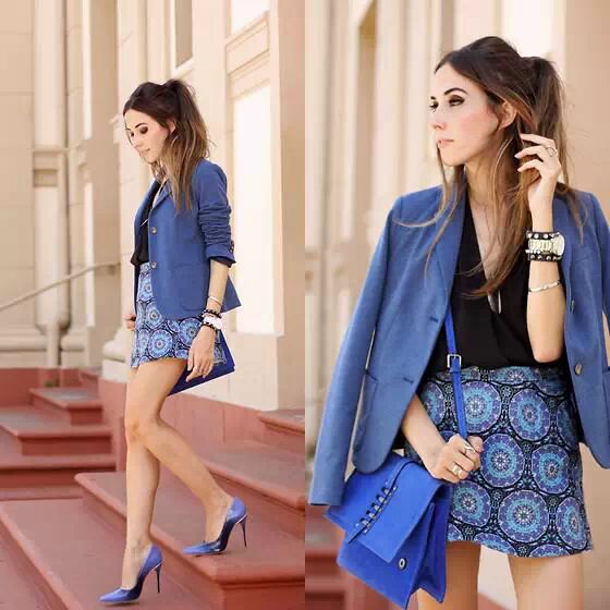蓝色小西装,款式简约大气,里搭雪纺V领衫,下穿蓝色圆花纹小包裙,露出性感大腿,脚穿蓝色高跟鞋,将蓝色系混搭的如此时尚帅气。