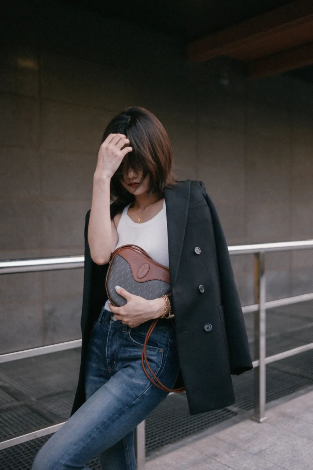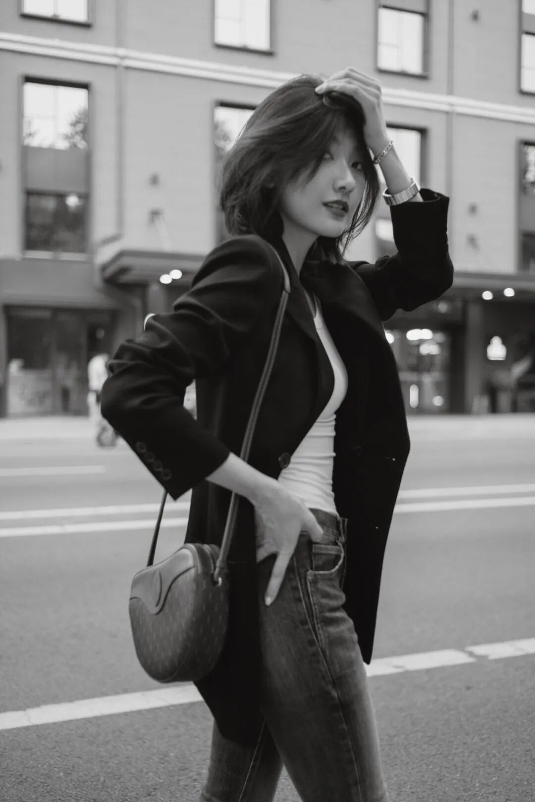 紧身牛仔裤加上标志性的垫肩西装,里面只要一件白色内搭就能打造一个日常的SL look。