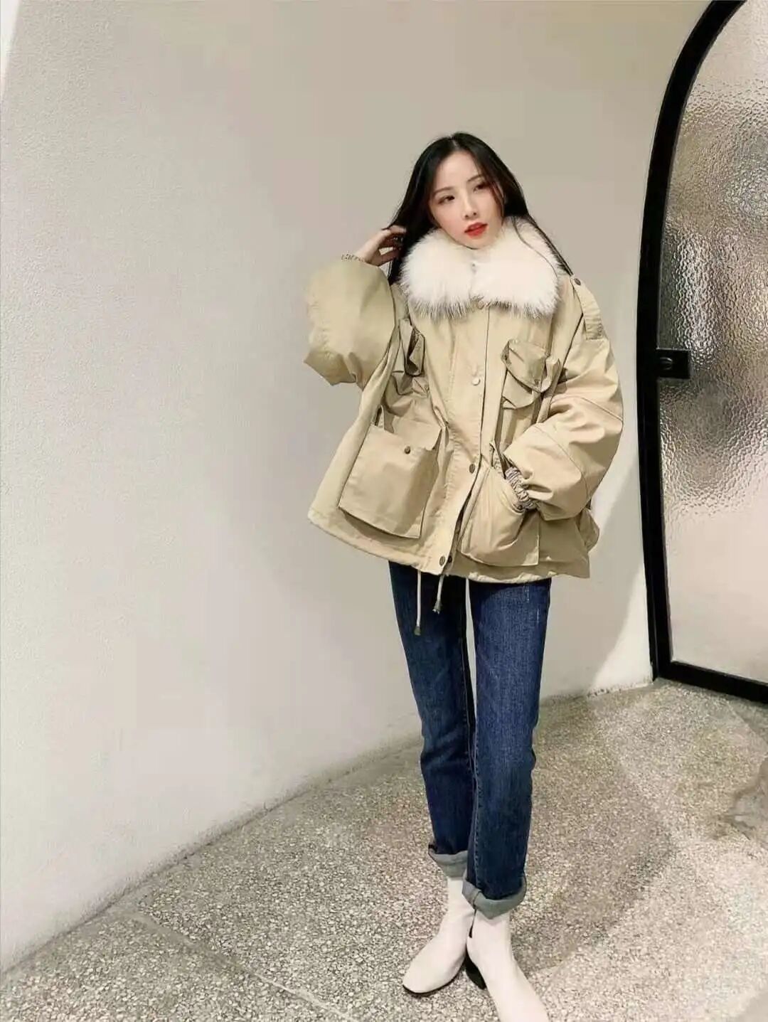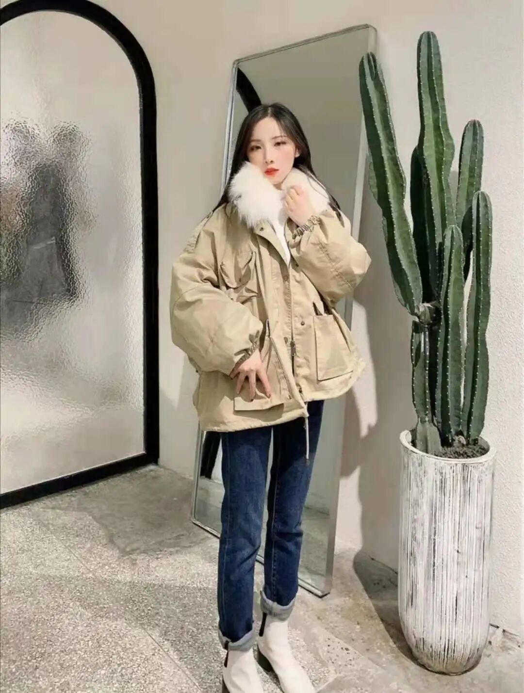 派克服是中短款,小个子穿上超级可爱,酷中带点甜味,工装风的款式跟羽绒服一样保暖,时髦度满分。偏简约宽松的版型,狐狸毛毛领更加温暖,光口袋就有好几个,感觉出门都不用带包了,下摆抽绳设计,宽松随意调节。这件卡其色的工装风派克羽绒服,内搭选择了白色的高领毛衣进行打底,下装是一条蓝色的牛仔直筒裤,加绒的版本更适合冬季,挽起了裤腿搭配了一双白色的短靴。