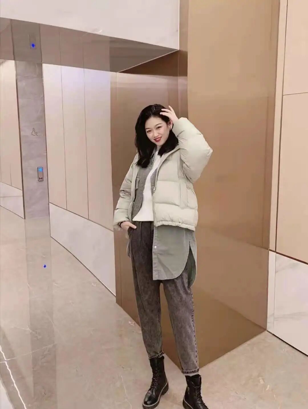 这身穿搭运用了叠穿的技巧,豆沙绿的短款羽绒服里面搭配了一款灯芯绒墨绿长款衬衣,这样的整体感觉是外短内长,可以对下身做一个很好的修饰,而且不同的绿色的过度也是非常有层次感,在衬衣的里面叠穿了白色的高领毛衣打底,下装是灰色的锥形裤搭配了黑色的马丁靴。
