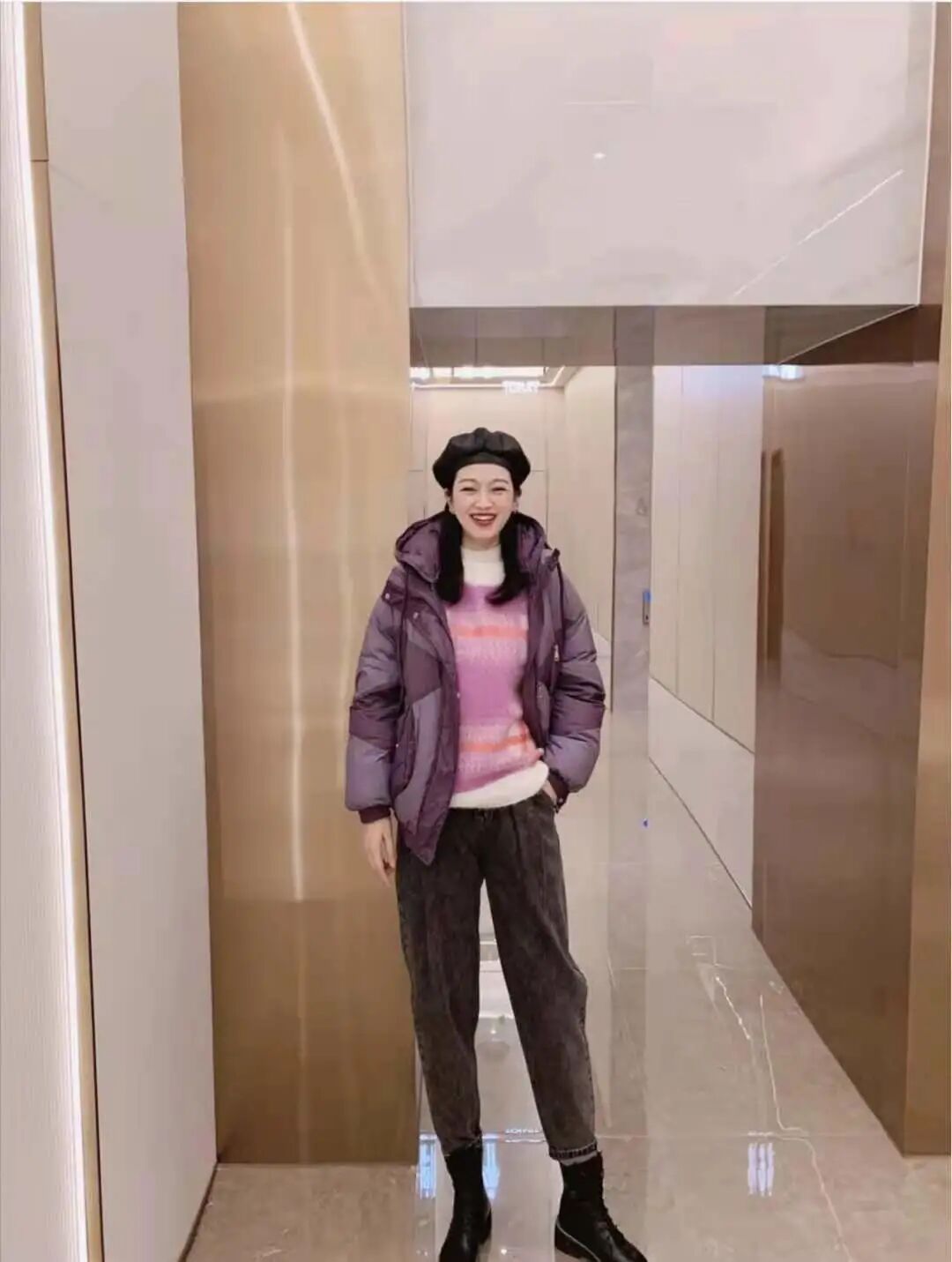 look5 甘蓝紫超轻羽绒服+内搭蓝色马海毛毛衣+灰色锥形裤+黑色马丁靴