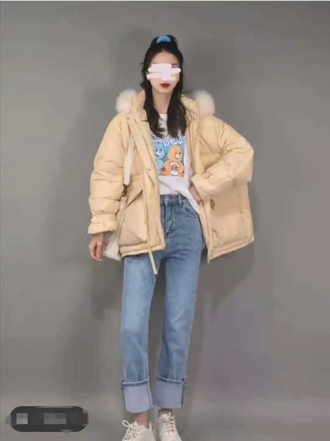 入手这件黄羽绒服,是敲可爱的蛋黄色,超级萌活力可爱,连帽而且毛领可以拆卸,袖口还能调节带,腰围抽绳收腰,两侧有口袋的,减龄显白,质感好羽绒服,内搭选择了卡通图案的白色卫衣,下身穿了复古蓝色的加绒直筒牛仔裤,翻起裤边搭配了一双白色的休闲鞋。