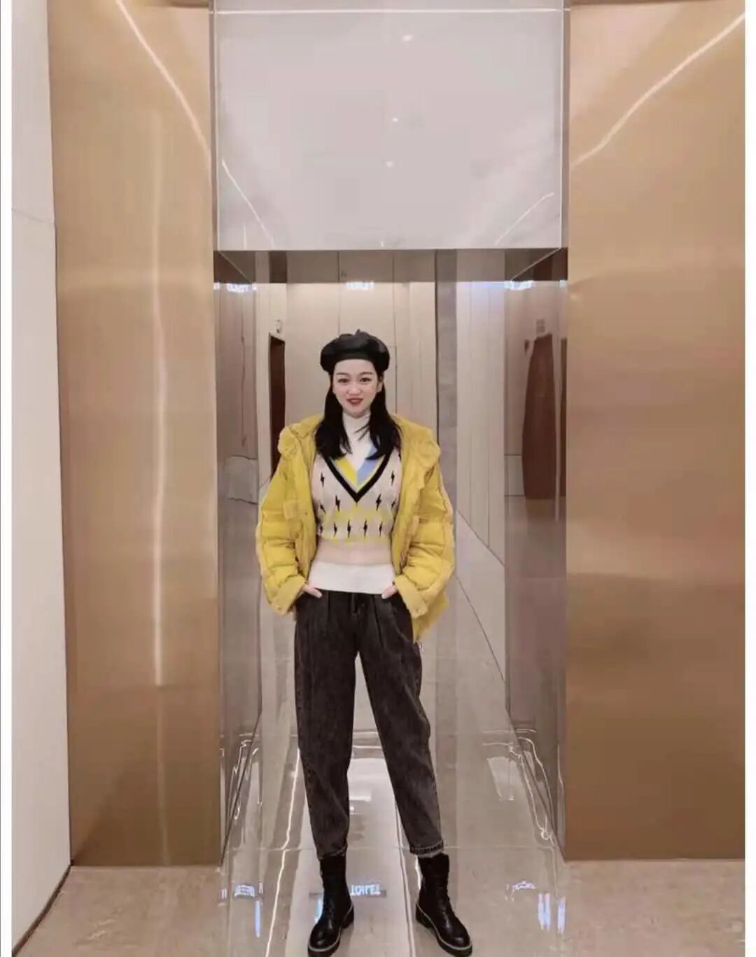 这款小黄鸭的羽绒服,颜色是每年冬天的常客,缝纫处是羽绒和皮毛的拼接,非常有冬天的感觉,毛毛质地柔软,里面搭配的背心可以和外套做一个很好的呼应,而且内搭是毛衣与毛衣的穿搭,下装选择了炭灰色的锥形裤搭配了黑色的马丁靴。
