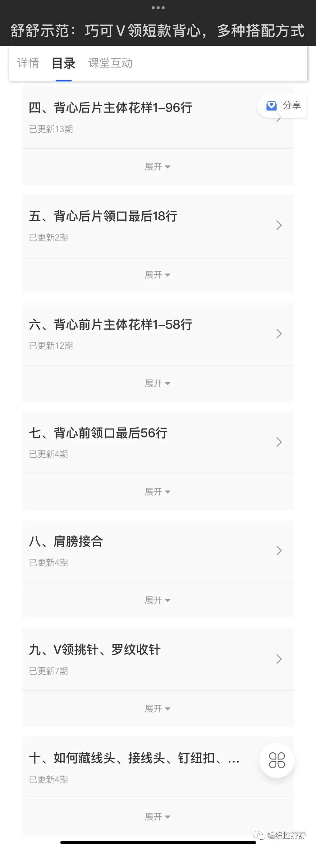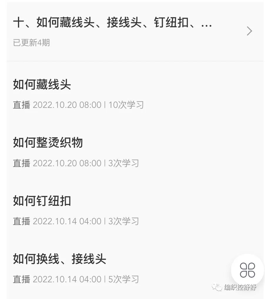 以第十专栏为例,内容细致到藏线头、钉纽扣、整烫织物,以我们线下课面对面的上课标准(收费100/小时)来制作线上课,目的是帮助编织小白了解一件毛线背心的完整编织课程。本课程随材料包免费赠送!