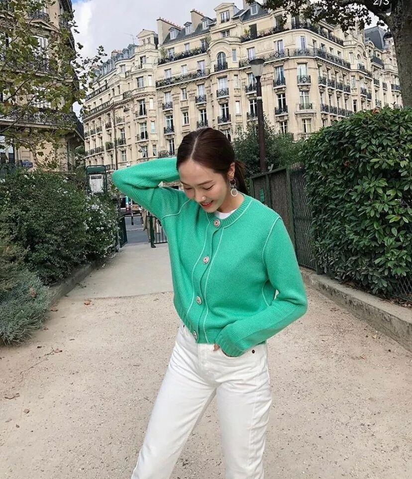 如果是紧身短款的开衫,可以像Jessica这样单穿,下面一件白色牛仔裤,优雅知性。