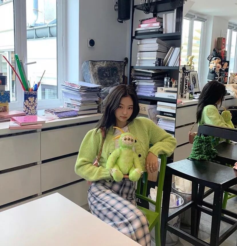jennie用格纹裤混搭绿色开衫,非常大胆的颜色搭配,走休闲路线的值得一试。