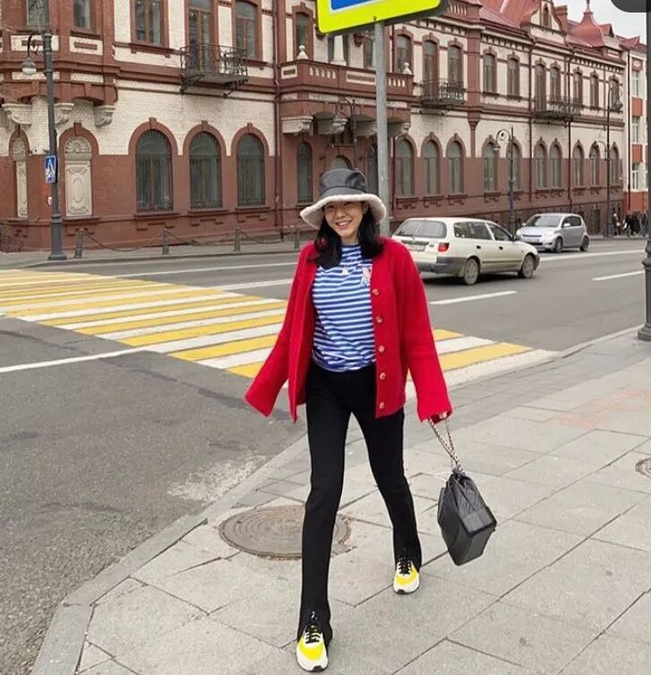 首先是仙女必备的开衫,春节刚过,红色也可以pick起来哦,内搭蓝色条纹的打底,颜色撞得非常洋气。