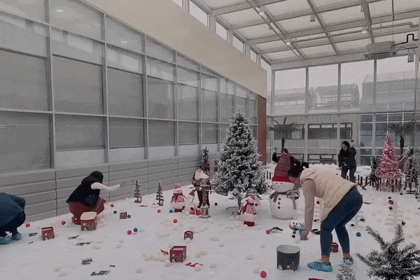 没有雪的圣诞节绝对是不完美的,没有关系,人工造雪为你服务,在办公楼里找一片空地,摆上各种带有圣诞元素小摆件,这样雪地嬉戏就可以正式拉开帷幕了。