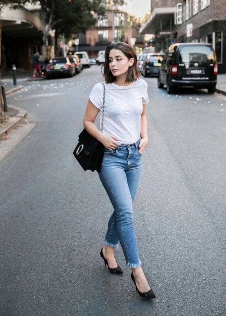 这款白色T恤搭配牛仔裤的穿搭基础干练一些,在白色T恤的穿搭基础上,在肩部搭配棕色格纹丝巾让白色T恤的穿搭造型不再简单,丝巾上的格纹图案雅致耐看,同时在配色上也与褐色西裤保持了一致,穿出的造型感很强,很符合中年女性优雅成熟的气质魅力。