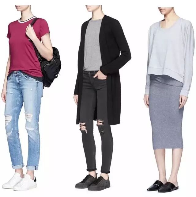 的组合是很好的选择,舒服但也有女人味,不怕坐姿太随意时走光又不会太过于邋遢。